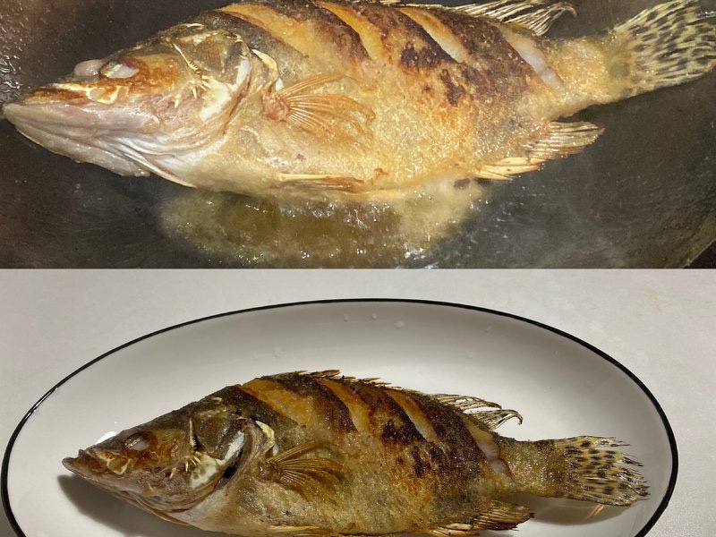 将晾干的臭鳜鱼放入油锅略煎,至两面呈淡黄色时,倒入漏勺沥油