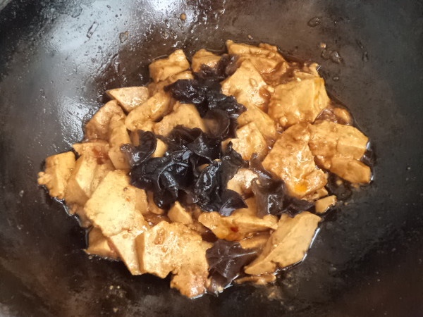 汤汁收少,木耳入锅炒。淋入薄芡,芡熟,即可出锅装盘。