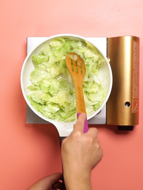 五花肉,蒜瓣,郫县豆瓣酱炒熟再加入包菜