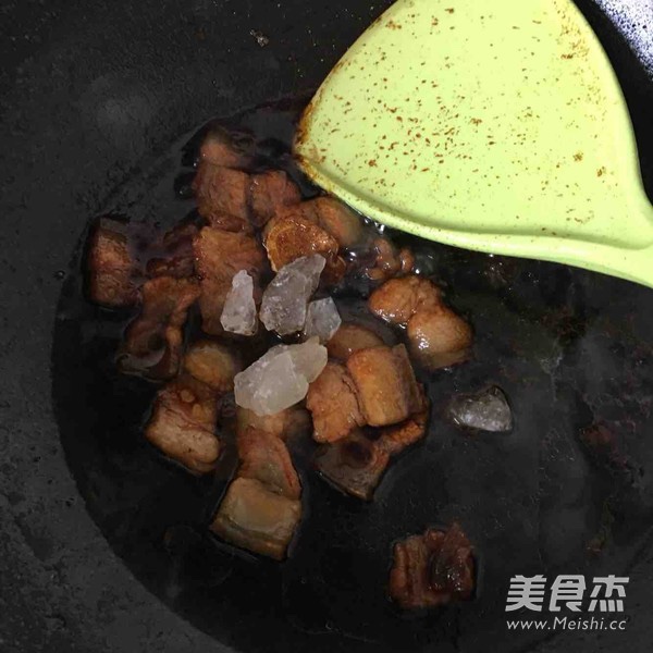 肉片加姜片下锅翻炒干再加油,这样油不会溅出。翻炒变色。加入黄酒、生抽、老抽、冰糖、盐翻炒上色