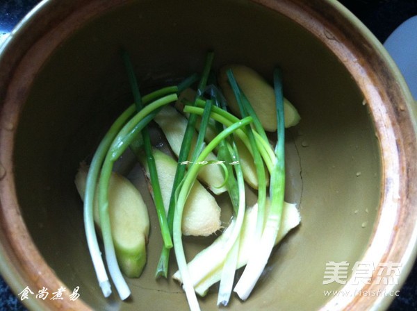 姜去皮洗净切片,葱去叶切长段。然后把姜、葱铺在砂锅底上,增香防止粘锅。