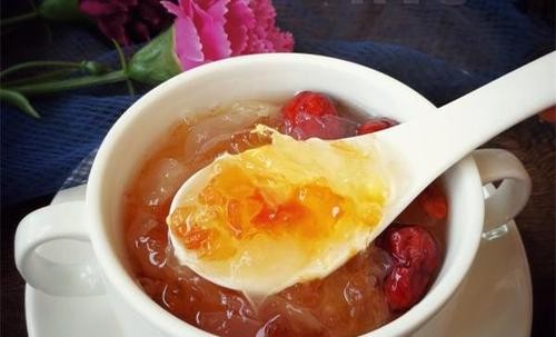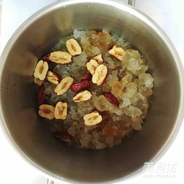 将红枣桃胶放入锅内加适量水煲滚后小火煲30分钟,接着加入银耳继续煲20分钟,出锅前10分钟加入冰糖。