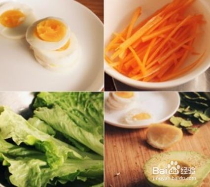 生菜洗净,胡萝卜切丝,用盐和黑胡椒调味。鸡蛋煮熟切片,牛油果切片。