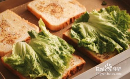 吐司上铺上两片生菜叶。