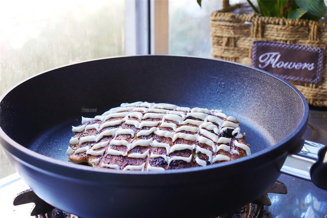将煎好的圆白菜培根面放在盘子上方,并"#”字形挤上照烧酱,然后再挤上蛋黄酱,撒上木鱼花即可