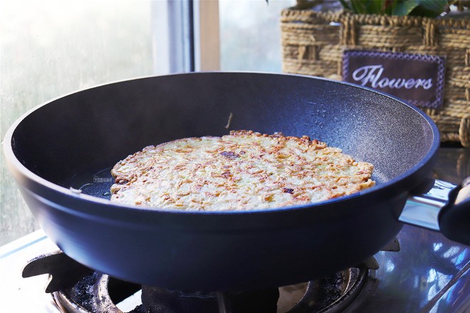 平底不粘锅倒少许植物油,放入混合好的圆白菜面糊,小火并使其固定成圆形并在上面铺上培根,大概3-4分钟后翻面,使两边都煎成焦黄色即可(这里不要总是翻面,这样容易散开,所以最好一面煎好后再煎另外一面)