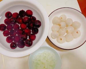杨梅洗一遍用盐水泡15分钟,荔枝剥皮备用(核随便你们去不去)冰糖装碗备用。