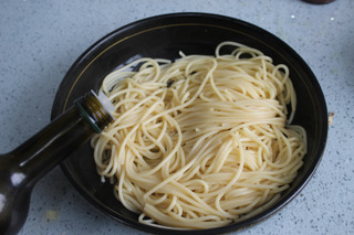 煮好后捞出,凉水过下加入少许的橄榄油拌匀。