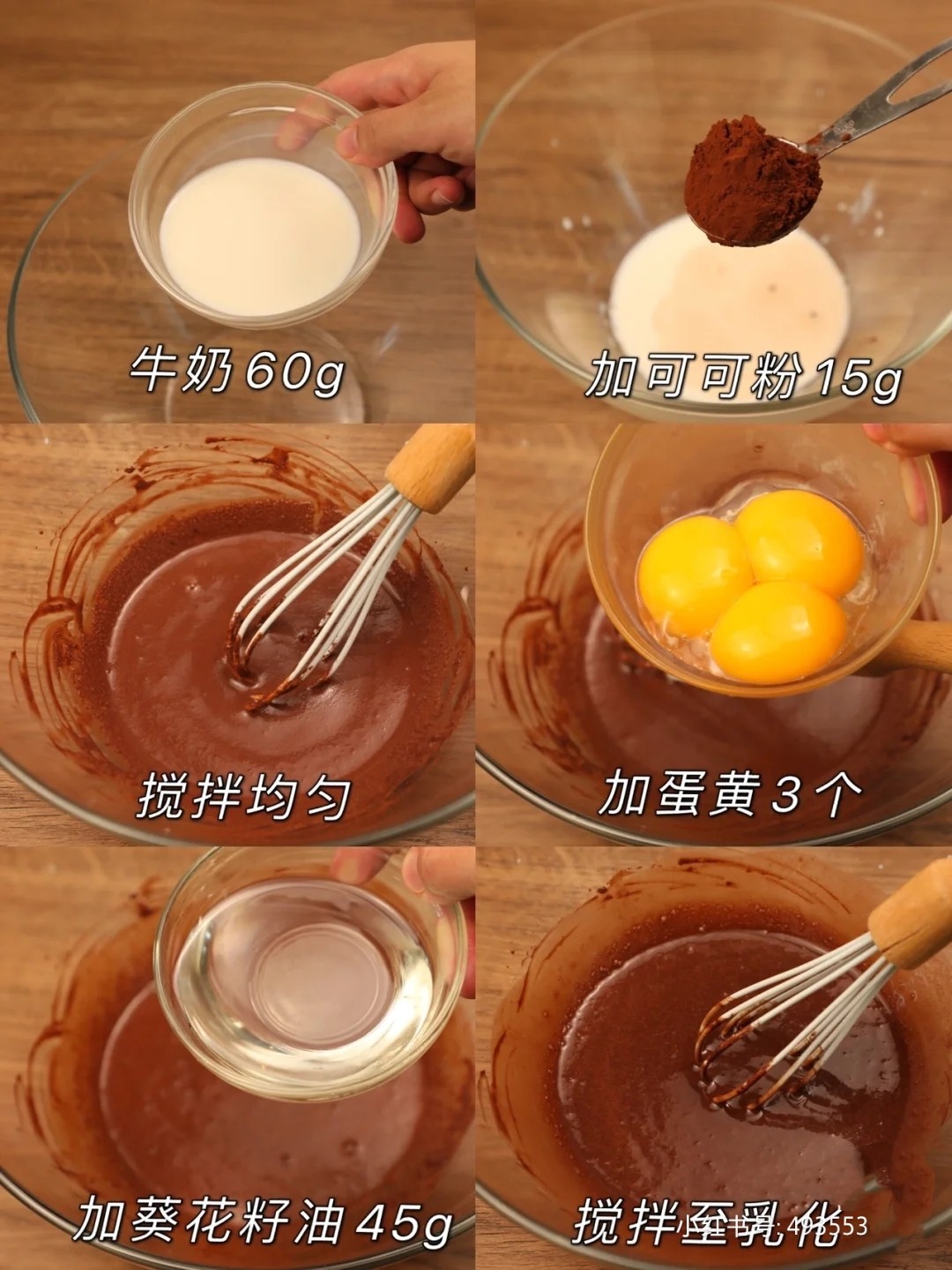 可可粉加牛奶先搅拌均匀,再倒入葵花籽油、蛋黄搅拌至乳化