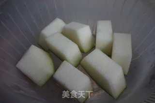 冬瓜洗干净,去瓤,不用去皮,冬瓜皮具有明显的利水作用,经过煲煮之后的冬瓜皮也蛮好吃的,将冬瓜切大块