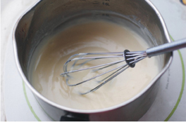 分三次兑入牛奶。边倒边充分搅拌没有面疙瘩,煮粘稠后将做好的白酱盛出备用。