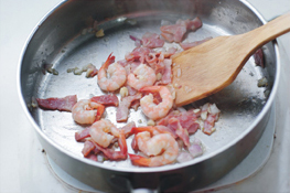 放入洋葱碎、蒜碎炒香后,倒入培根和鲜虾翻炒。