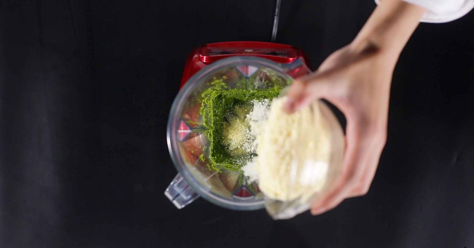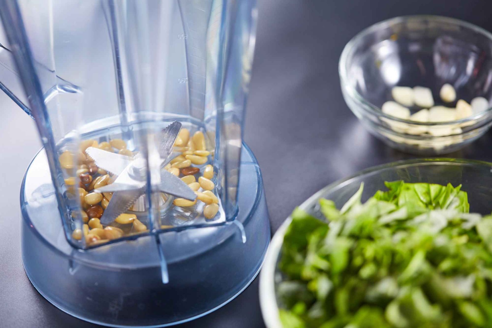 取出提前冷藏的料理机杯体,将松子仁、大蒜、50ml橄榄油、60g罗勒叶放入,装上杯体并用料理机快速档打碎