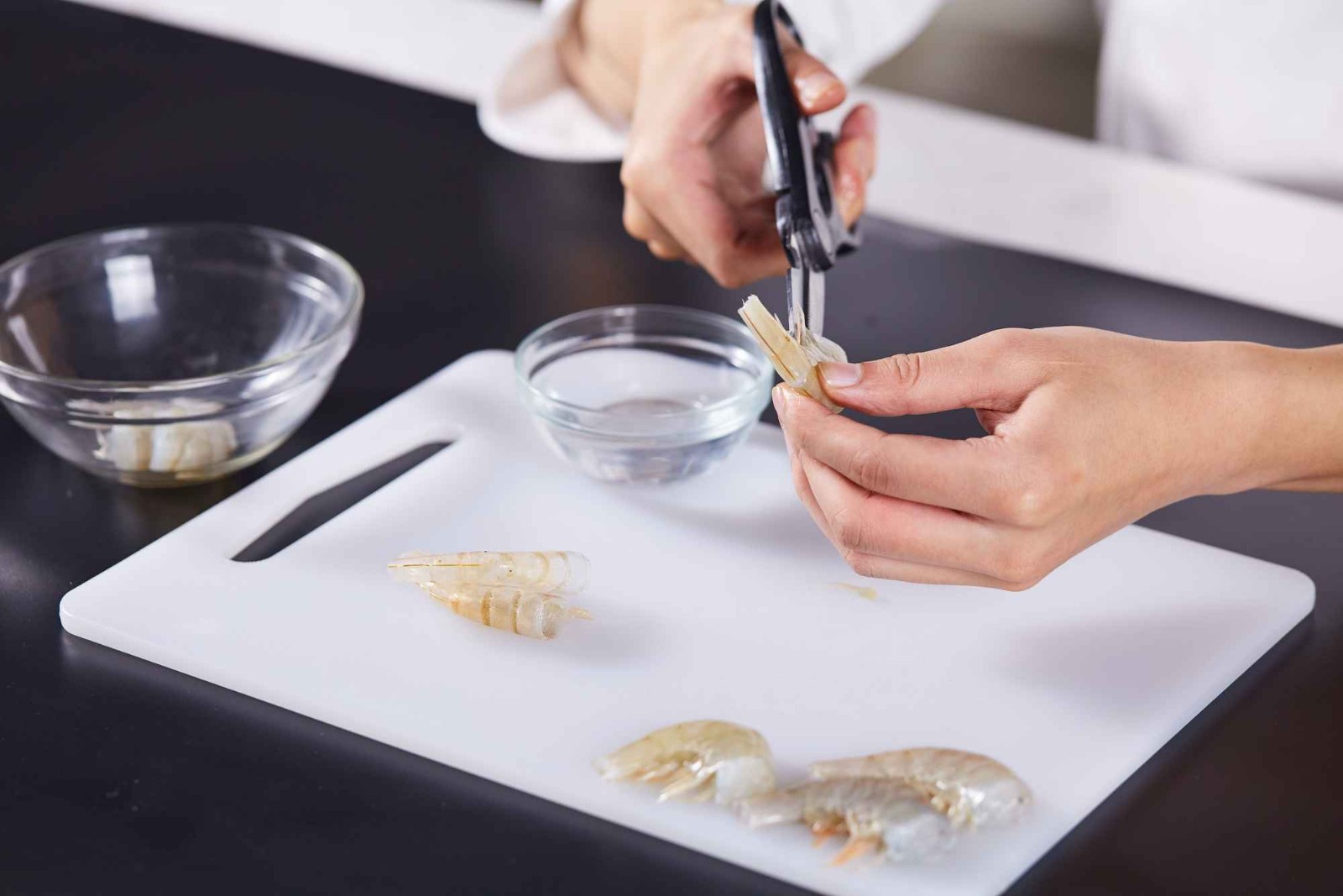 鲜虾去头去尾去壳,剔除虾线,并将虾子切成小段