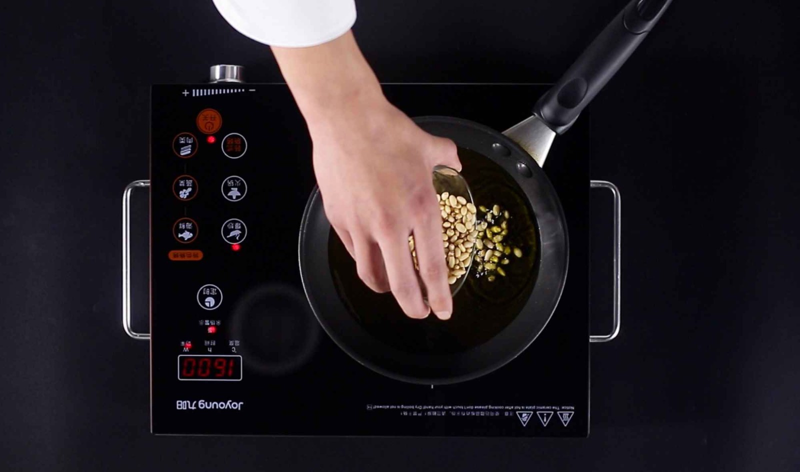 生松子仁放入油锅中用小火煎一小会儿,颜色金黄后捞出备用,并提前把料理机杯体放入冰箱冷藏