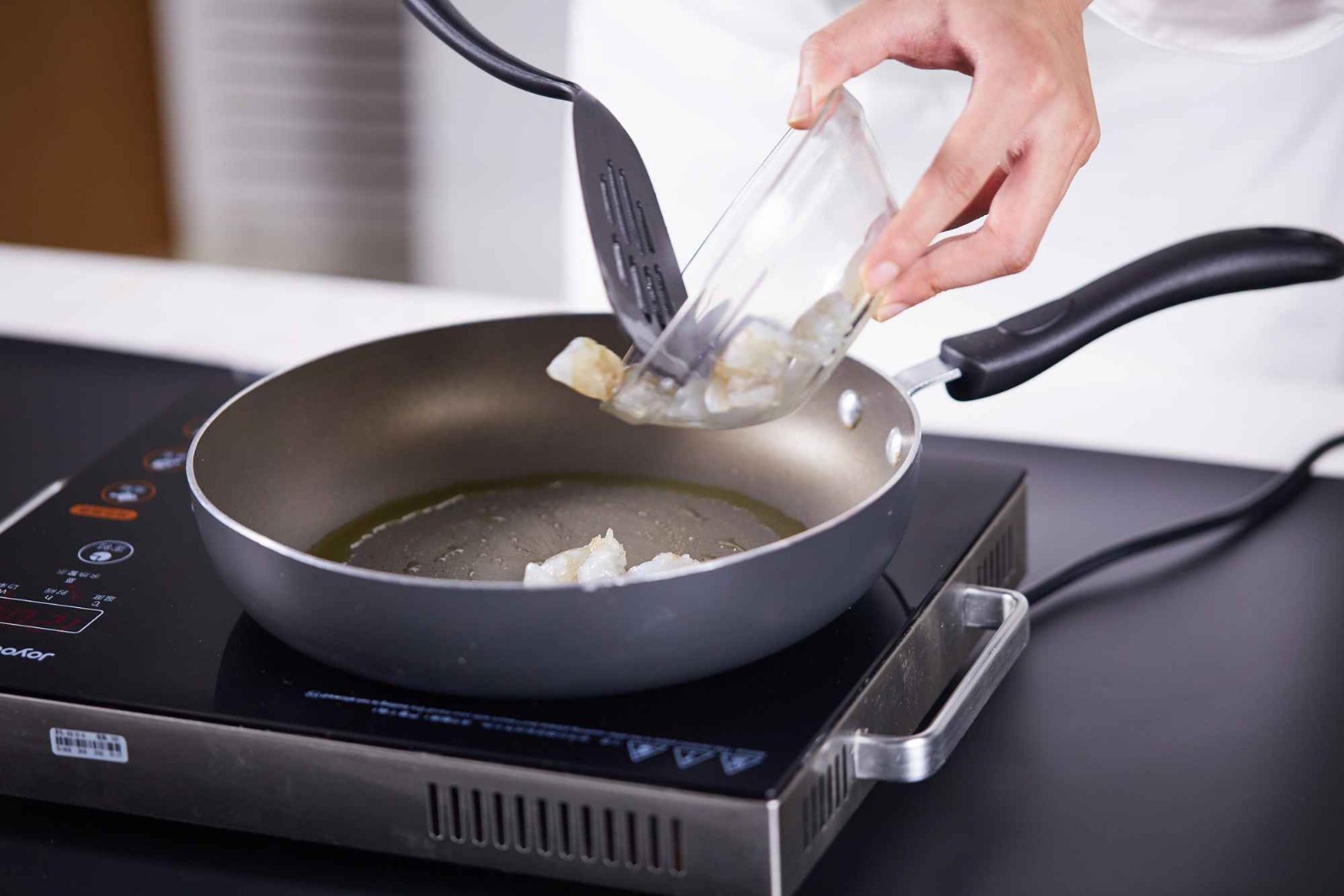 加热平底锅,倒入15ml橄榄油,放入处理好的虾子翻炒.将虾肉翻炒到8分熟,然后加入贝壳面,添加50g淡奶油,让虾子和意面充分混合,并将虾子炒熟