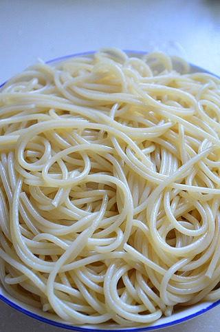 水烧开后在锅里加入少许盐、植物油,把意面放入水中煮熟