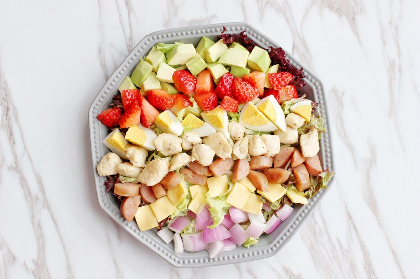 生菜切小段,洋葱切片,牛油果切丁,芝士片切小块,草莓切丁,鸡蛋煮熟切块,猪肉肠切丁,鸡胸肉切丁