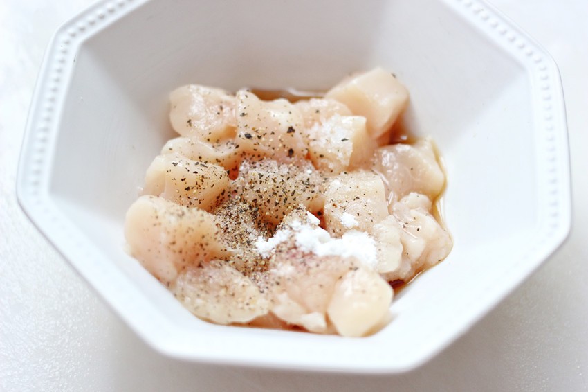 鸡胸肉里加少许盐、淀粉、料酒和黑胡椒搅拌均匀至上劲并腌制一会