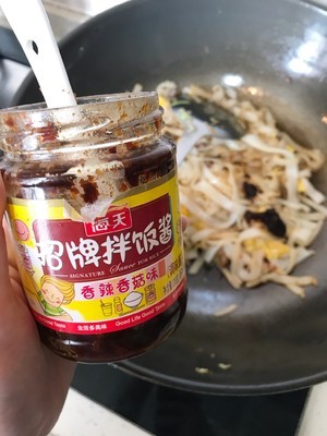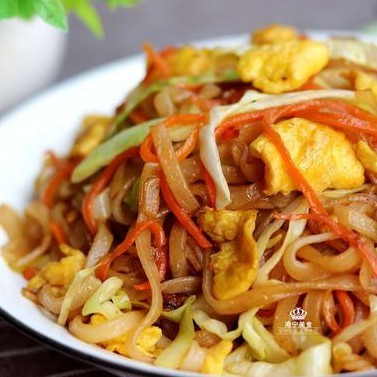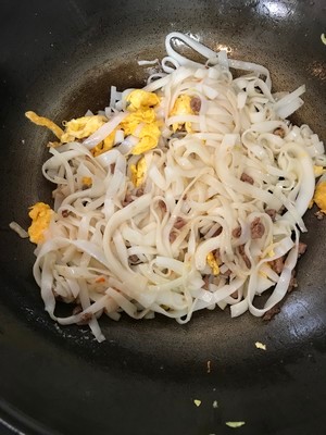 炒瘦肉片刻加河粉炒一分钟,再加刚刚炒好的鸡蛋炒一分钟
