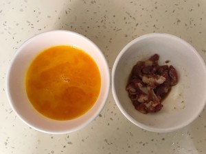 鸡蛋打散,瘦肉加一点点淀粉和酱油腌制片刻