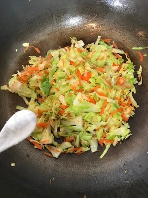 油锅炒熟包菜丝萝卜丝,加两勺盐,然后盛起来