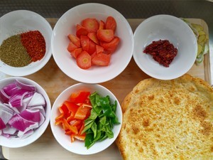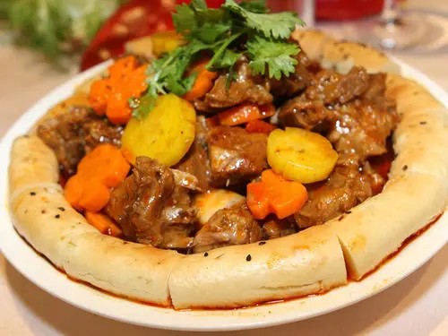 洋葱切片,青红椒切菱形片,胡萝卜切滚刀块,准备好郫县豆瓣、孜然粉、辣椒粉、花椒粉,更重要的是准备好一个刚出炉的新疆馕饼