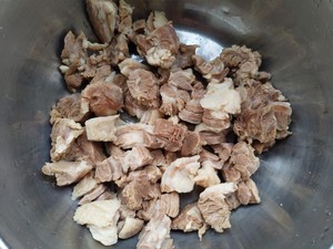 将羊肉切成核桃大小的块,入凉水锅中加盐、料酒烧开,打净浮沫,再将肉捞出用水清洗干净,待用
