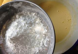 蛋黄容器里加入酸奶(比较浓稠的那种),将它们搅拌均匀。面粉和淀粉混合后筛入蛋黄酸奶液中,用刮刀翻拌均匀,无颗粒即可。最后可以用打蛋器打几圈,使面糊更细腻顺滑