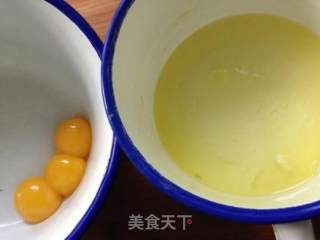 分别将蛋黄和蛋清分离,分别放入两个无油无水的容器里,用打蛋器先来打发蛋白,蛋白中可以放一丁点食盐或是白醋来去腥,也可以不放哦!