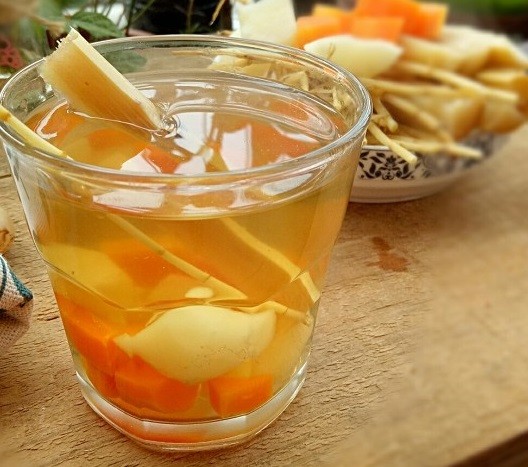 竹蔗开边、切段;马蹄去皮切对半(或不去皮拍裂);红萝卜刮皮切段;鲜茅根切段。 一起放进瓦煲内,加入清水,武火滚沸改文火煲1小时即可(或下少许冰糖)。