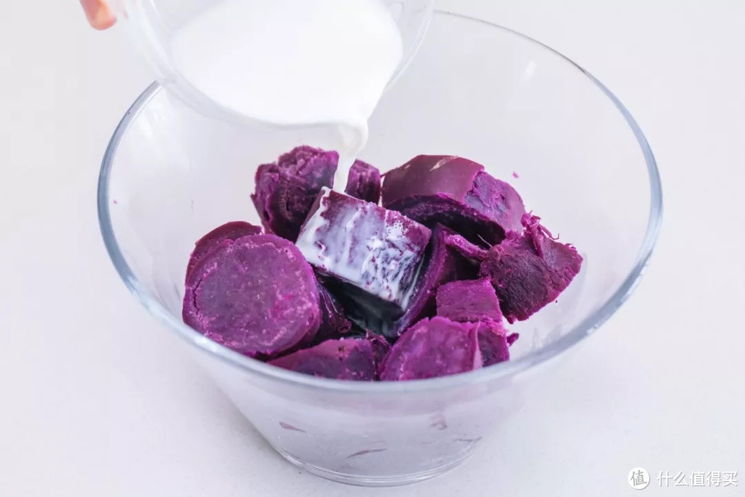 蒸好的紫薯去皮,切成小块,加入30g牛奶。加牛奶可以让紫薯泥更香浓更湿润一些,如果喜欢干一点的也可以不加。