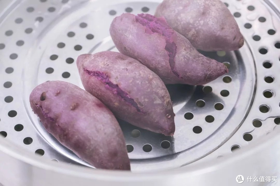 紫薯洗净,放入烧开水的锅中,大火蒸15分钟左右,蒸至紫薯用筷子轻轻就可以戳穿。