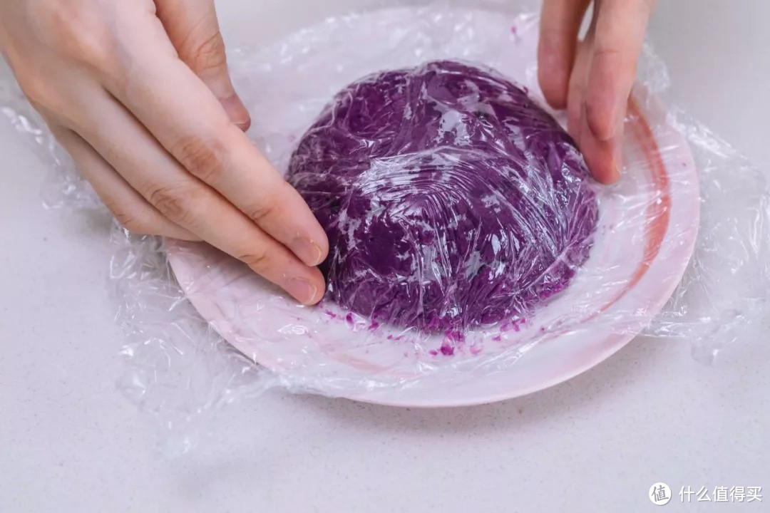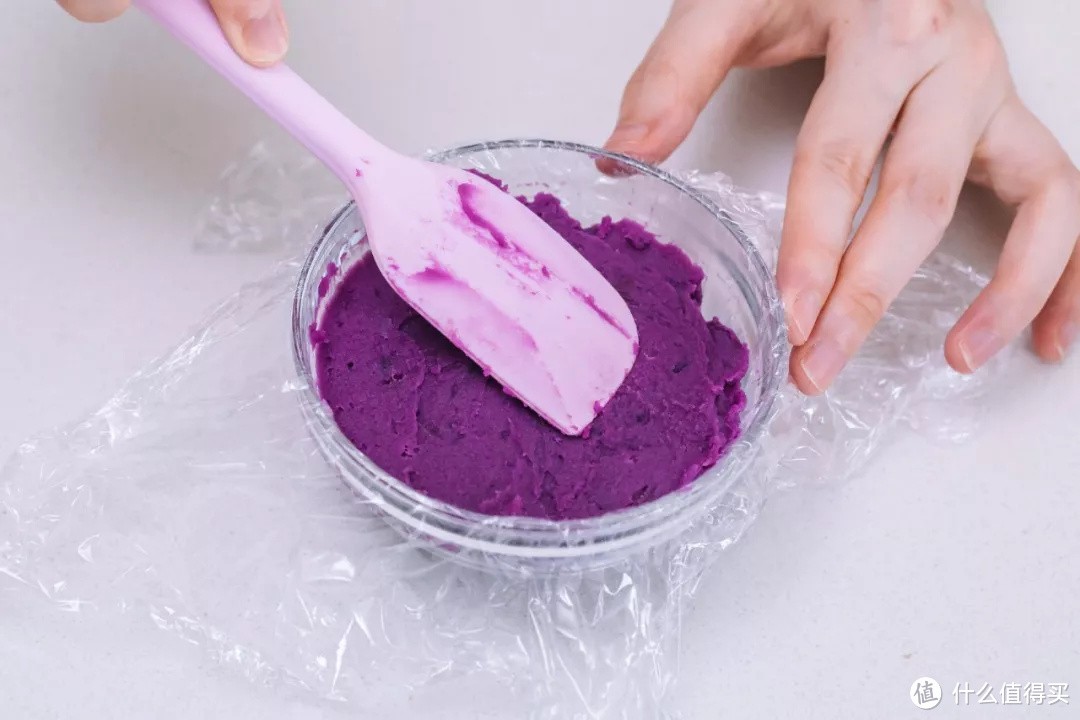 碾压好的紫薯泥填装进垫有保鲜膜的小碗中。