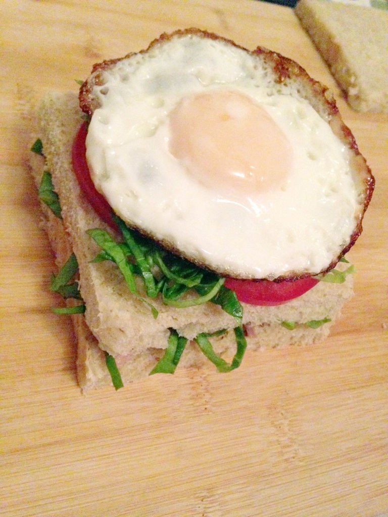 再铺上一层生菜丝,最后压上半熟的煎蛋,再盖上最后一片面包