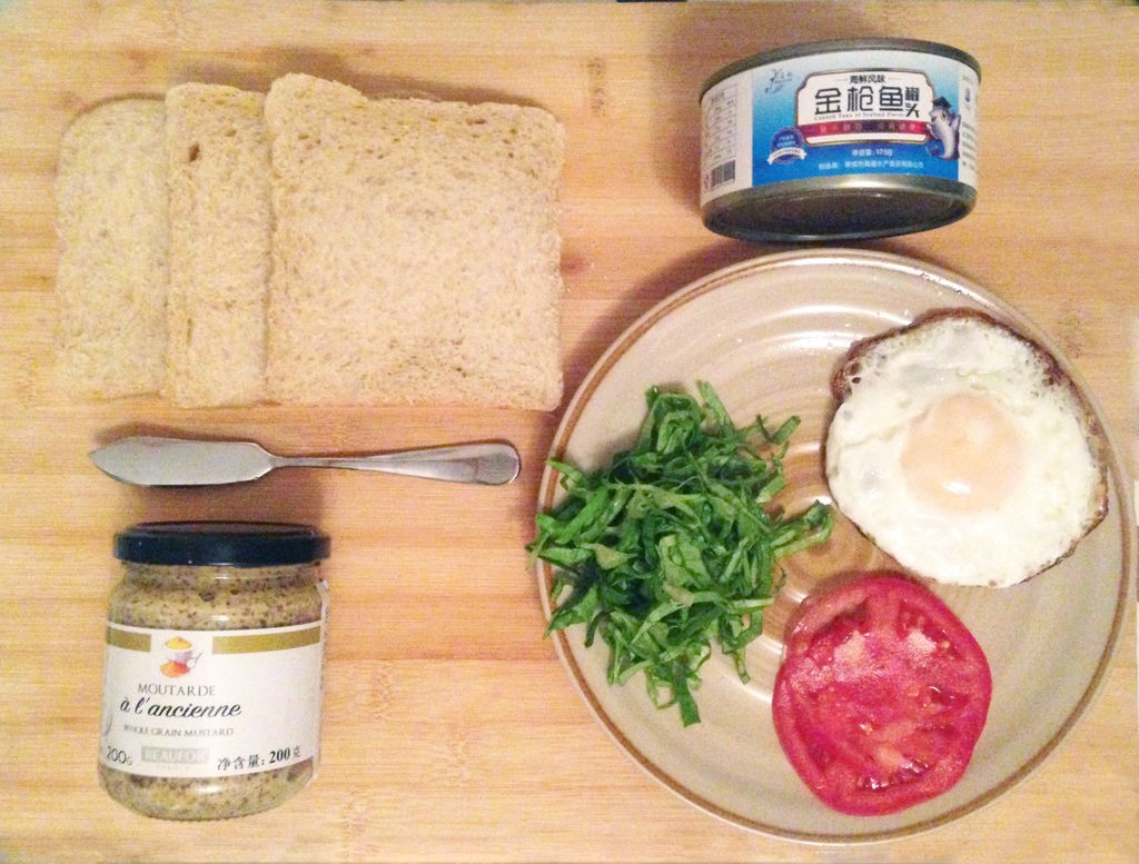 吐司切片,生菜切丝,番茄切薄片,鸡蛋煎单面,金枪鱼剁碎烤熟