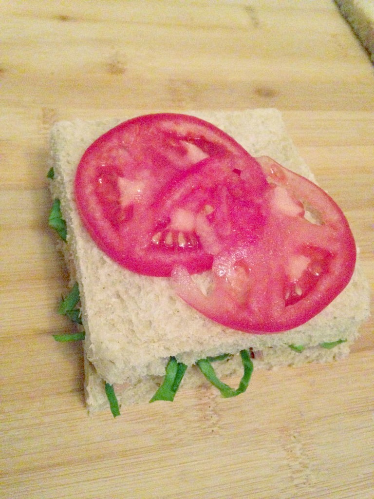 压上中间的面包片,然后盖上两片西红柿片。