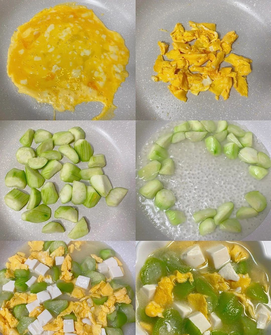 鸡蛋炒7分熟捞出备用,丝瓜去皮切成块,放入锅中翻炒几下倒入热水,丝瓜煮熟后再放入鸡蛋和豆腐,加少许盐和白胡椒粉,煮2分钟即可。