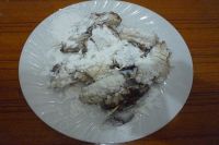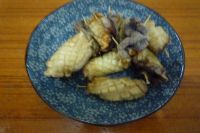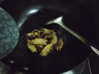 炒锅放足量油,烧制七成热,放入拍好淀粉的香菇下锅炸制。