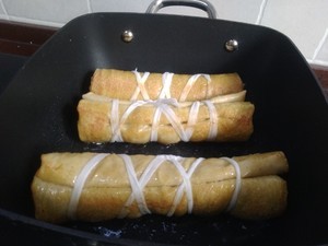平底锅放油,把卷好的豆皮煎到表面金黄。