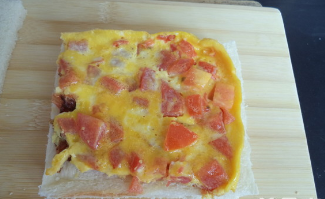 吐司切去四边后挤上沙拉酱,放上番茄鸡蛋。