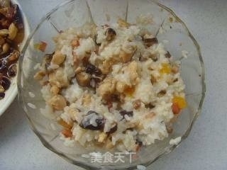 爆炒香菇和鸡肉后与泡好的糯米饭混匀