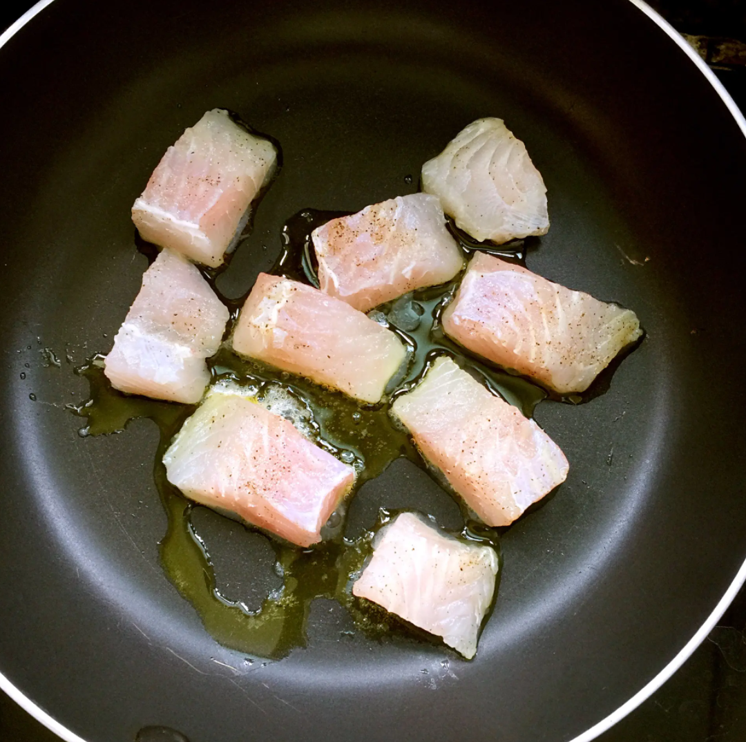 将龙利鱼放入平底锅后撒上黑胡椒、海盐,挤入柠檬汁,撒上白葡萄酒,小火慢煎