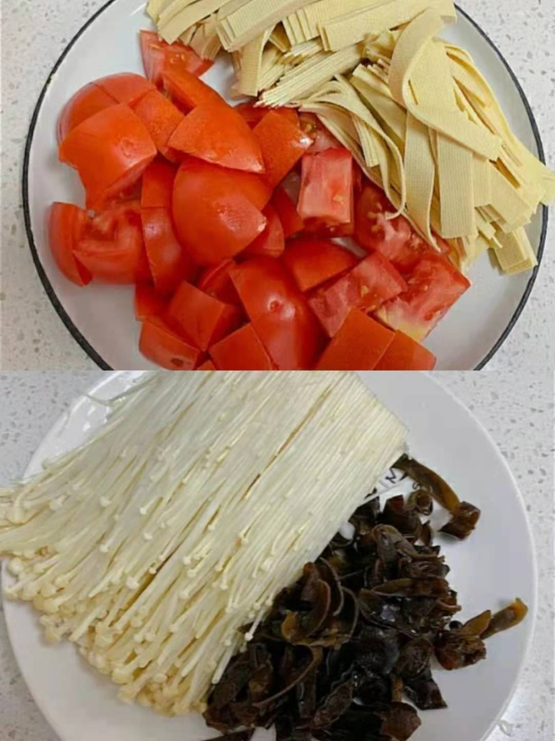 将食材洗净,番茄切块,豆皮切丝,木耳泡发切丝