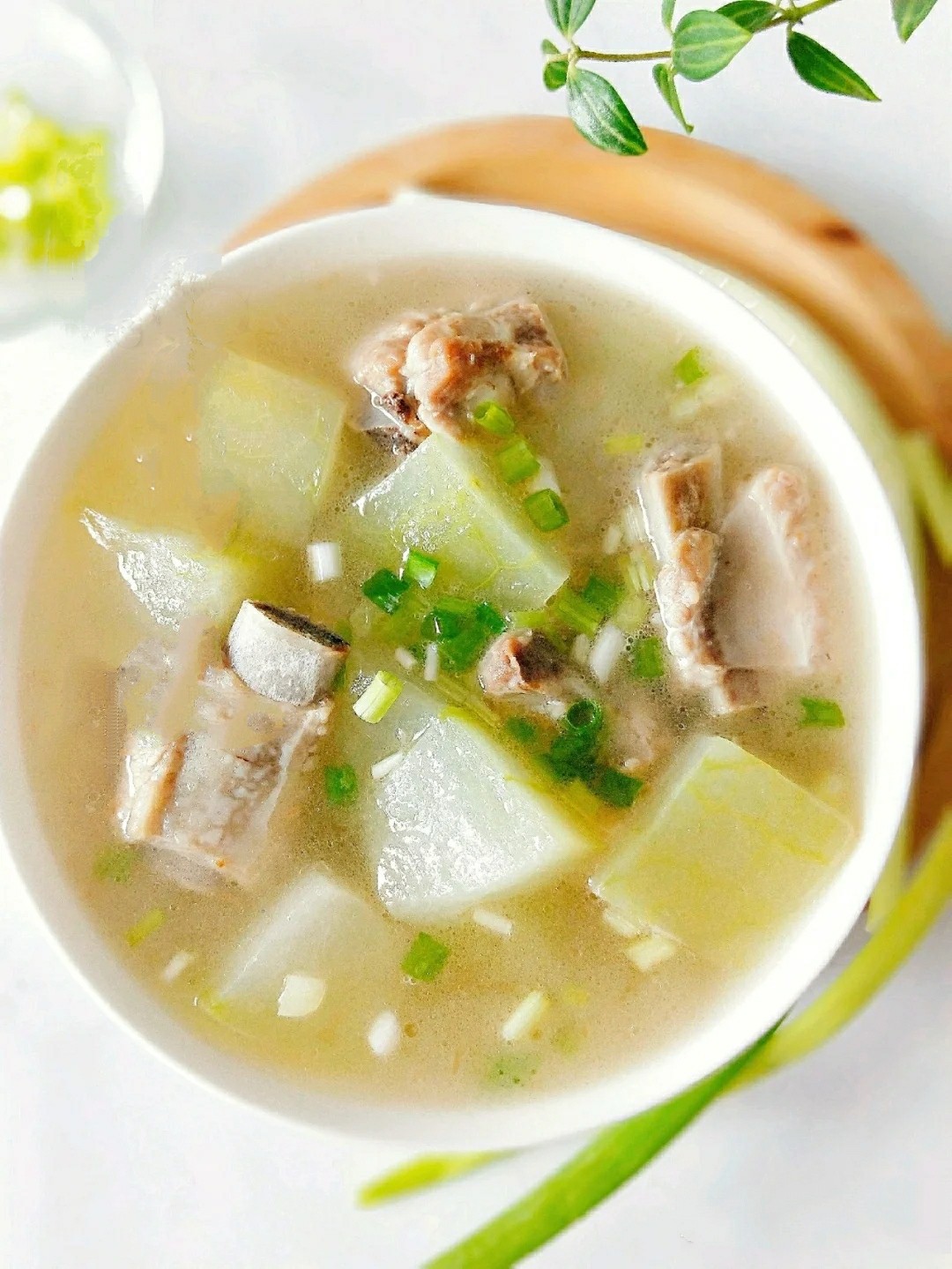 将冬瓜去皮去籽切成小块,在排骨加水大火煮沸一段时间后,下入冬瓜小火炖煮