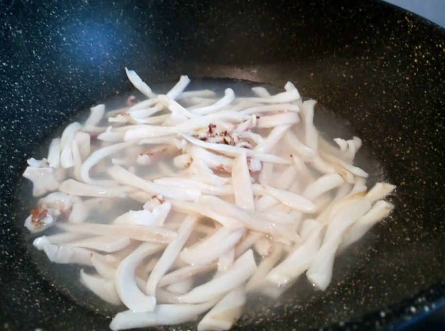 将鱿鱼洗净,水开下锅焯水30秒后盛出备用