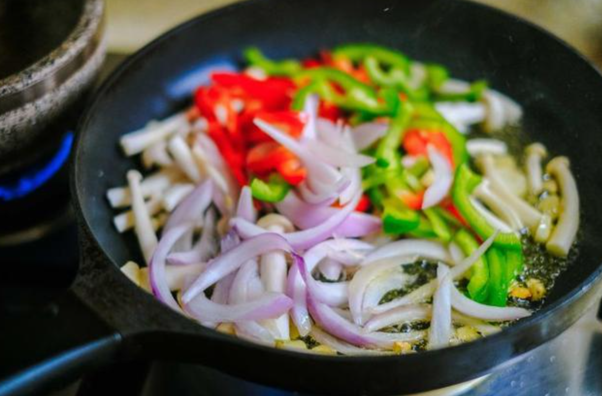 将洋葱和彩椒切丝后下锅爆炒出香味,加入鱿鱼翻炒均匀
