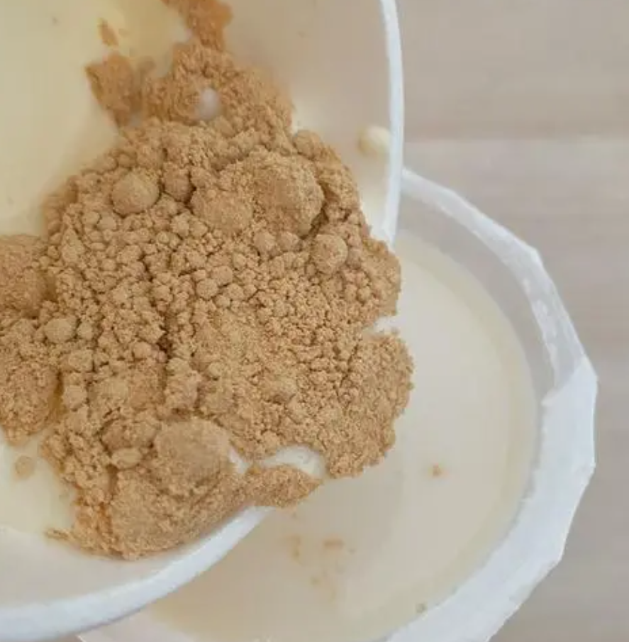 将洋车前子壳粉倒入牛奶混合,放入微波炉加热40秒,制作伪麻薯