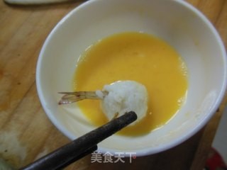 鸡蛋事先在碗中打散成蛋液,虾球放入沾满蛋液。