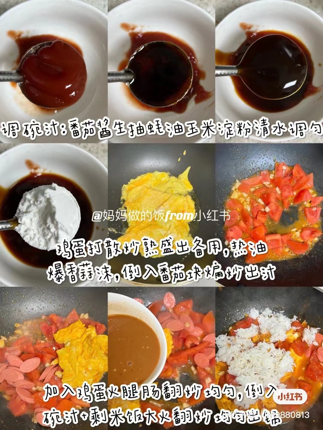 食材:调料勺子直径4CM 3个鸡蛋,1个较大的番茄,1根火腿肠,5个蒜瓣,1小碗剩米饭。 碗汁:3勺番茄酱,1勺生抽,1勺蚝油,1勺玉米淀粉,半碗水。 做法: ①调碗汁:3勺番茄酱+1勺生抽+1勺蚝油+1勺玉米淀粉+半碗水调匀。 23个鸡蛋打散炒熟盛出备用,热油爆香5个蒜瓣沫,倒入1个番茄块煸炒出汁。倒入鸡蛋+1根火腿肠切的片,翻炒均匀。 3倒入碗汁+1小碗剩米饭,大火翻炒均匀即可。